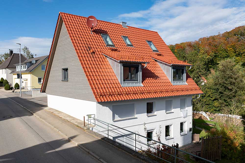 Bei dem hier vorgestellten Dachausbau in Ingoldingen handelte es sich um ein leer stehendes zweistöckiges Gebäude, das grundlegend renoviert und nach einem Dachausbau mit drei Mietwohnungen ausgestattet werden sollte. Die Zimmerei Rettich aus Tiefenbach bekam den Zuschlag für die Arbeiten am Dach. Das bedeutete im ersten Schritt, die in die Jahre gekommenen Ziegel abzudecken und den bisher ungedämmten Dachstuhl zu ertüchtigen.