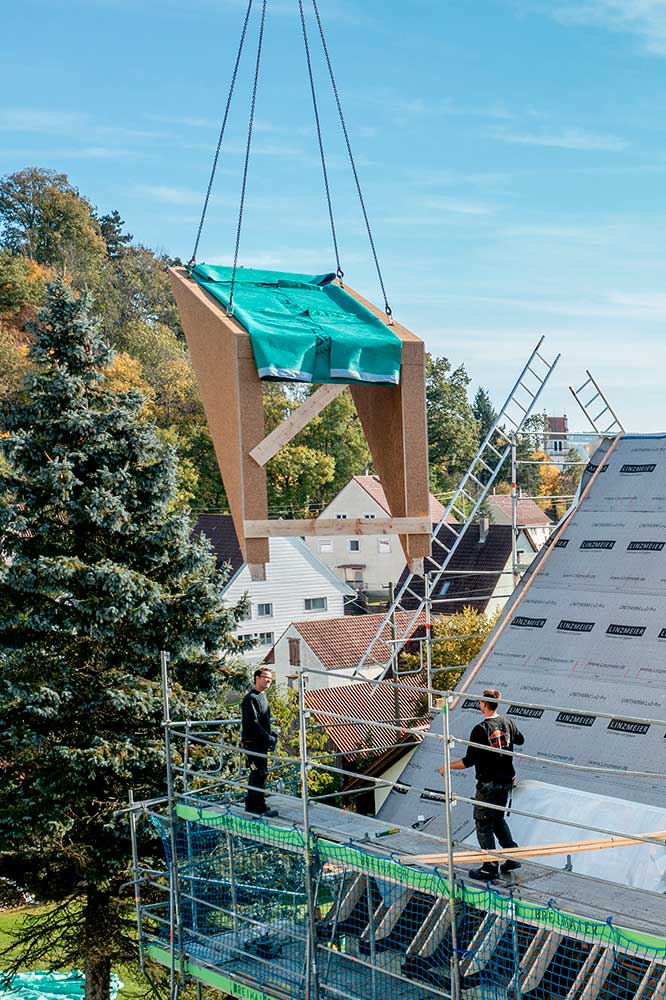Die Gaubenbauteile setzte die Zimmerei Rettich mit den Zimmereimitarbeitern auf der Baustelle zur fertigen Gaube zusammen. Mit dem Kran aufs Dach gehoben, passten die Gauben auf Anhieb.