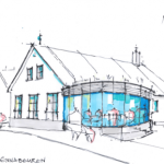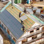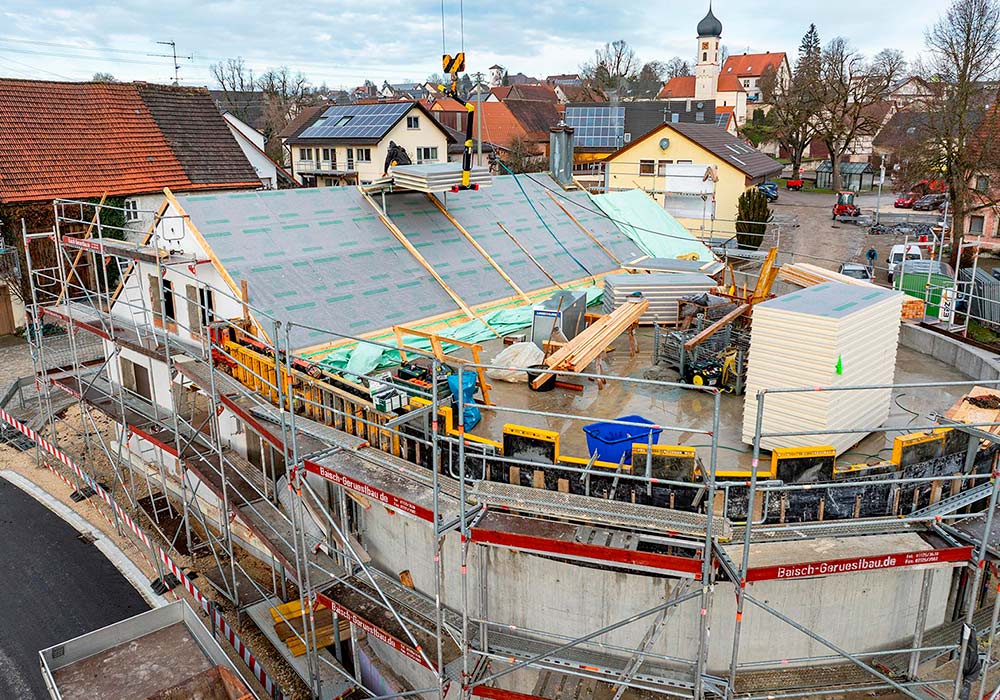 Zentraler Punkt der Ortsmitte ist das Backhaus aus den 1920er-Jahren. Dieses wird im Zuge der Baumaßnahmen saniert und um einen halbkreisförmigen Glasanbau erweitert. Durch die künftige gastronomische Nutzung soll das historische Gebäude auch wieder zum sozialen Mittelpunkt des Ortes werden. Die Sanierungsarbeiten können über eine Webcam (https://heroldstatt.kuckuck.cam/) verfolgt werden. Darauf findet man auch die Arbeiten des Zimmerermeisters Johannes Erz aus Laichingen-Machtolsheim. Er und sein Team dämmten im November die Dachflächen des Backhauses mit dem biobasierten Hochleistungsdämmstoff LINITHERM LOOP PAL 2U. Mit den 160 mm dicken Platten erreicht das Dach einen U-Wert von 0,13 W/(m²K) und erfüllt somit allein mit der Aufsparrendämmung den förderfähigen Wert von 0,14 W/(m²K). Die Verlegung des Dämmstoffs auf den beiden Dachflächen konnte so schnell ausgeführt werden, dass die Webcam diesen Arbeitsschritt nicht dokumentieren konnte.